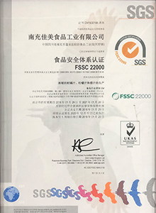 南充佳美于2018年取得了FSSC 22000食品安全體系認證證書。