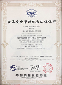 南充佳美于2014年按ISO 22000標準建立食品安全管理體系,同時取得ISO 22000食品安全管理體系認證證書。